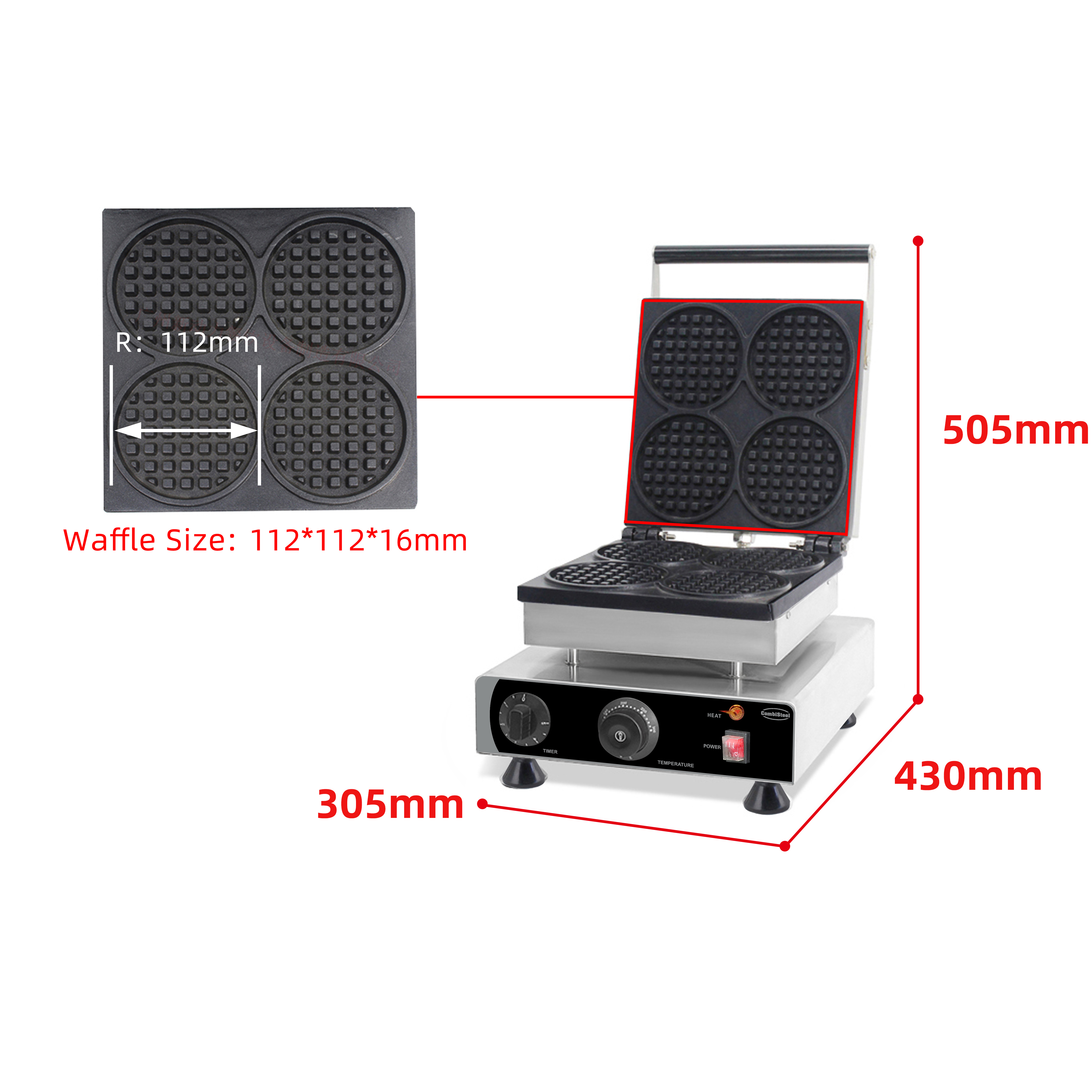 - Runde Backplatten: Backen Sie 4 Waffeln auf einmal.
