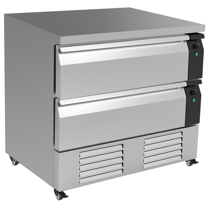 Cette table réfrigérée/congélateur spacieuse et performante avec 2 tiroirs de 2x 1/1 GN est parfaite pour les cuisines professionnelles où la capacité et la flexibilité sont essentielles. Chaque tiroir peut être réglé individuellement en mode réfrigérateur ou congélateur et dispose d’un contrôle digital indépendant. La table est dotée d’un plan de travail robuste et résistant à la chaleur, aux dimensions américaines. Grâce à son design sur roulettes et la possibilité de la placer contre un mur, vous optimisez l’espace disponible. Équipée d’un refroidissement ventilé et d’un dégivrage automatique – pour des performances stables avec un entretien minimal. Taille des tiroirs : 2x 1/1 GN par tiroir, adaptés aux bacs jusqu’à 150 mm de hauteur. Dimensions : 905x700x865 mm – Puissance : 0,46 kW – Capacité : 179 litres – Température : +1/+4ºC ou -18/-21ºC – Poids : 113 kg.