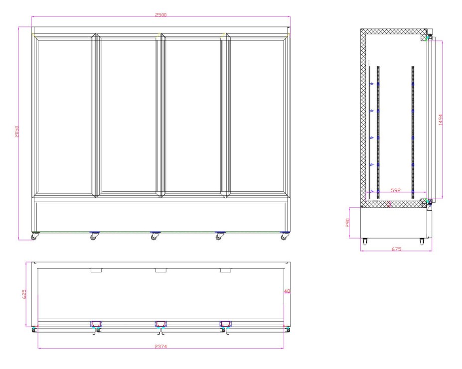 Ce réfrigérateur noir présente un design moderne, des portes à fermeture automatique, des étagères réglables et un affichage numérique de la température. Le système de refroidissement ventilé garantit une réfrigération efficace, tandis que le dégivrage automatique minimise l'entretien. L'éclairage LED met vos produits en valeur de manière optimale, et les portes chauffées empêchent la condensation, facilement activables ou désactivables. Dimensions : 2500x705x2050mm (LxPxH) - consommation 1,24 kW - capacité 2000 litres - temp. 0/+10ºC - poids 344 kg.