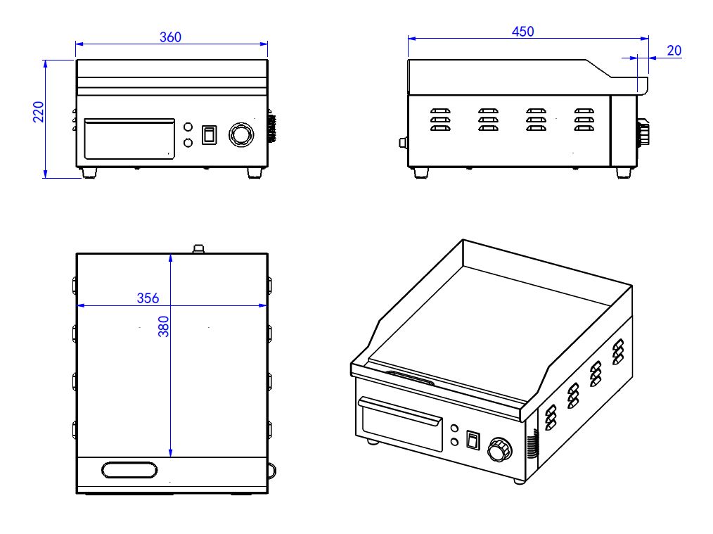 Perfect voor zowel thuisgebruik als kleine professionele keukens, biedt deze compacte bakplaat gelijkmatige warmteverdeling en nauwkeurige temperatuurregeling. Dankzij de RVS behuizing en de uitneembare olieopvangbak is schoonmaken een fluitje van een cent. Bereid de heerlijkste gerechten met gemak en stijl. De afmetingen zijn 360x450x220mm (LxDxH) - verbruik 2.0 kW - temp. +50/+300ºC - gewicht 16.5 kg.