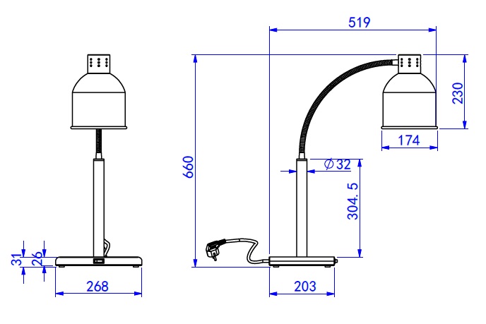 Maak kennis met onze warmhoudlamp, een essentiële aanvulling voor elke professionele keuken en cateringomgeving. Deze compacte en robuuste lamp is vervaardigd uit ijzer, wat zorgt voor duurzaamheid en een stabiele constructie. Dankzij de krachtige lamp biedt deze lamp een efficiënte warmteverdeling, perfect voor het behouden van de optimale serveertemperatuur van voorgerechten tot desserts, terwijl de versheid en smaak behouden blijven. De afmetingen zijn 268x203x660mm (LxBxH) - verbruik 0.25 kW - gewicht 5.5 kg.